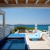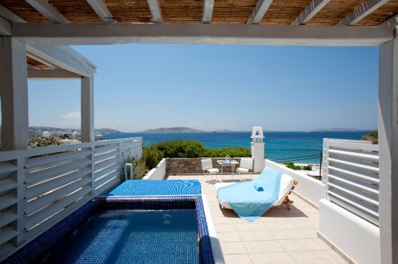 Джуниор сюиты с джакузи имеют просторные террасы с подогреваемыми джакузи, комфортабельные спальни и современные ванные комнаты. С террас открывается вид на остров Делос и порт Миконоса (площадь внутри – 26-30 кв. м, снаружи – 12-30 кв. м).