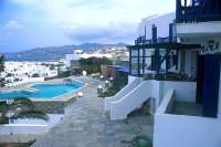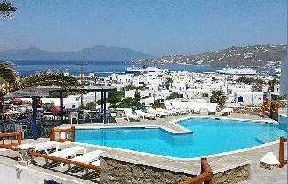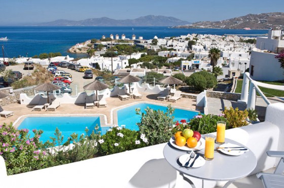 Отель построен в традиционном микенском стиле и расположен прямо напротив знаменитых ветряных мельниц в городе Миконос. Из отеля открывается панорамный вид на Эгейское море.