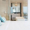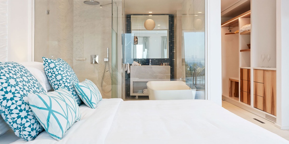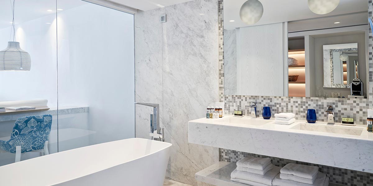 Интерьеры выполнены в современном стиле с белым мрамором, деревянными элементами и дизайнерским освещением.