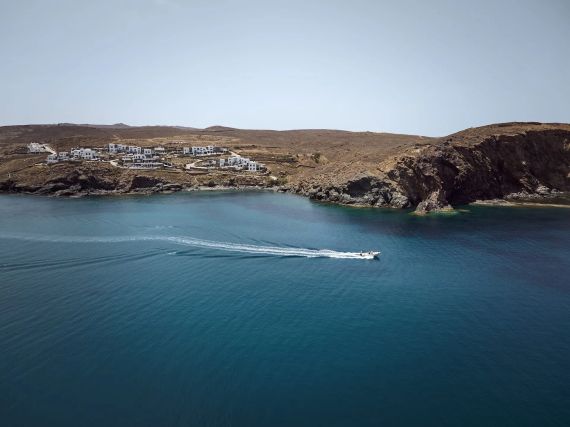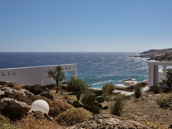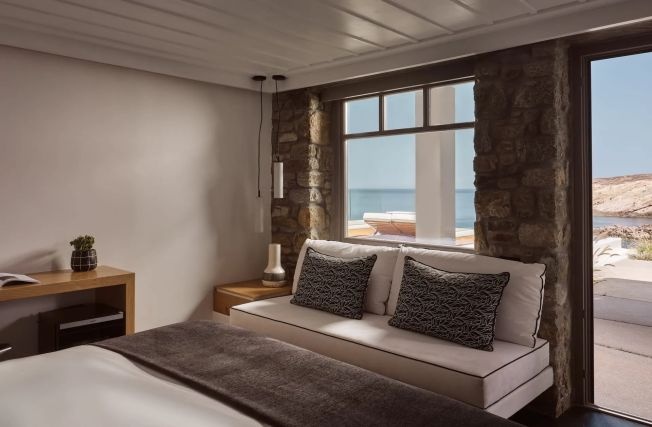 Спальня с двуспальной кроватью, гостиная комната с диваном и обеденной зоной, ванная комната с душем, терраса, обеденная зона на террасе (внешняя площадь – 120 м²), персональный бассейн (32 м²); панорамный вид на море, см. план номера;