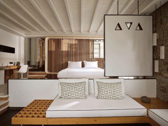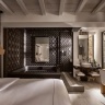 Спальня с двуспальной кроватью, 2 ванные комнаты (одна с душем, другая с джакузи), гостиная комната с диваном и обеденным столом, терраса с обеденной зоной (внешняя площадь – 80 м²) и персональным бассейном (32 м²); панорамный вид на море, см. план номера;