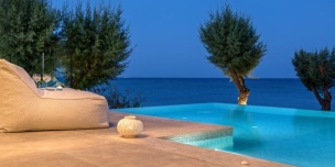 мелкогалечный пляж в 80 метрах от отеля (шезлонги и зонтики — платно)