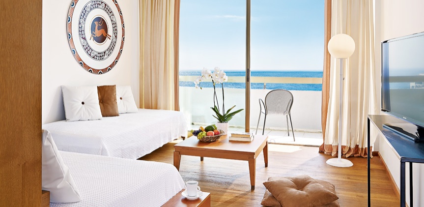 Номера расположены в крыле Kallithea и в крыле Rhodes,  двуспальная или 2 односпальные кровати, гостиная зона с одноместным диваном-софа, ванная комната с ванной, вид на море, балкон или терраса (5-7 м²);