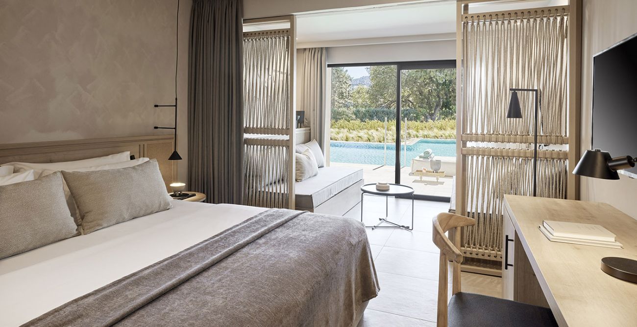 - Junior Suite Pool View & Swim Up (32 м², макс. 4 чел.).
