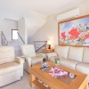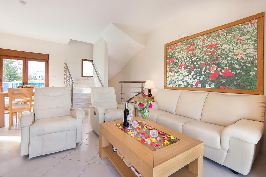 Главная спальня на верхнем этаже – двуспальная кровать, телевизор, кондиционер, сейф, ванная комната (ванна, WC, фен, банный набор). На нижнем этаже – 2 спальни. В одной из них – односпальная кровать, письменный стол, раздвижная дверь с выходом в сад, кондиционер, телевизор; во второй спальне – односпальная кровать, раздвижная дверь с выходом в сад, кондиционер и телевизор. Здесь же ванная комната с ванной и душем, банный набор. На цокольном этаже – стиральная машина, гладильная доска, сушилка. На первом этаже (ground floor) также расположена гостиная с оборудованной кухней открытой планировки, обеденный стол. Современная мебель, телевизор, спутниковое ТВ, Wi-Fi интернет, раздвижная дверь с выходом в сад и к бассейну.
