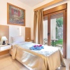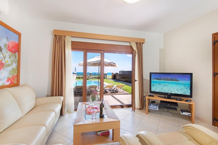 3 двуспальных кровати и диван-кровать. Главная спальня на верхнем этаже – двуспальная кровать, телевизор, кондиционер, сейф, ванная комната (ванна, WC, фен, банный набор). На нижнем этаже – 2 спальни. В одной из них – двуспальная кровать, письменный стол, раздвижная дверь с выходом в сад, кондиционер, телевизор; во второй спальне – двуспальная кровать, раздвижная дверь с выходом в сад, кондиционер и телевизор. Здесь же ванная комната с ванной и душем, банный набор. В цокольном этаже – стиральная машина, гладильная доска, сушилка. На первом этаже (ground floor) также расположена гостиная с оборудованной кухней открытой планировки, обеденный стол. Современная мебель, телевизор, спутниковое ТВ, Wi-Fi интернет, раздвижная дверь с выходом в сад и к бассейну. С южной стороны с видом на море расположен бассейн с небольшим водопадом из каменной стенки (бассейн – 25 кв.м.). Рядом с бассейном – веранда с лежаками и зонтами, небольшой столик, душ рядом с бассейном. Ночная подсветка на дорожке, ведущей к морю.