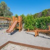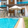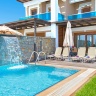 С южной стороны с видом на море расположен бассейн с небольшим водопадом из каменной стенки (бассейн – 25 кв.м.). Рядом с бассейном – веранда с лежаками и зонтами, небольшой столик, душ рядом с бассейном. Ночная подсветка на дорожке, ведущей к морю.