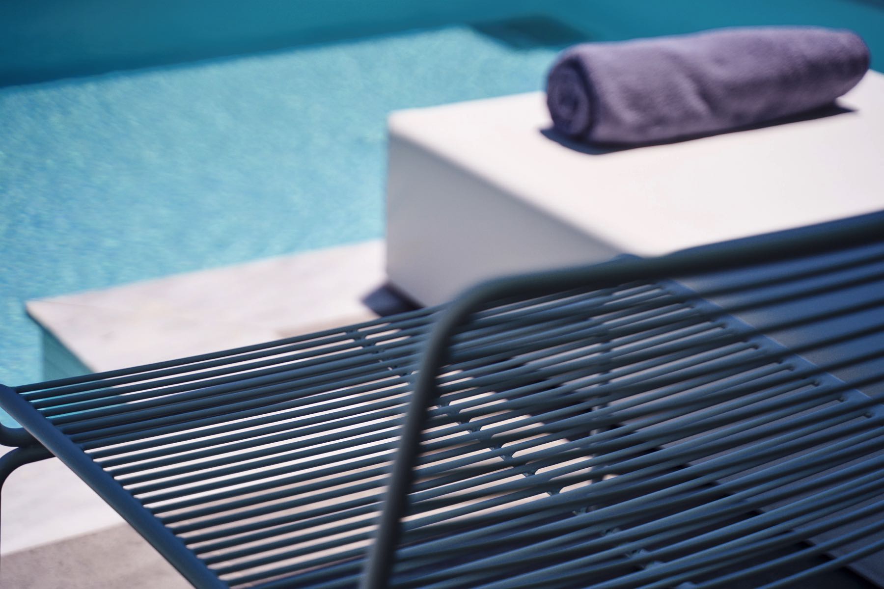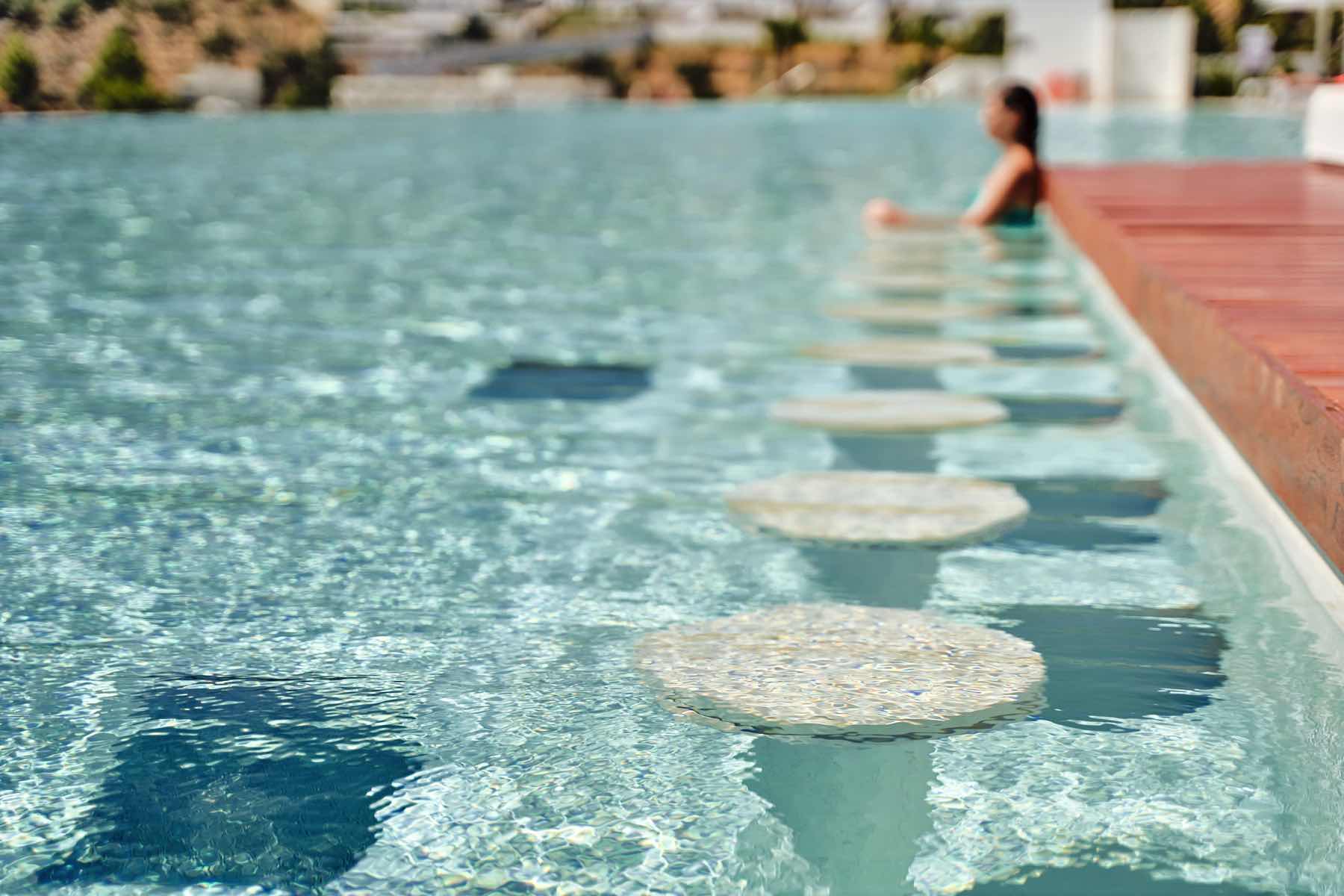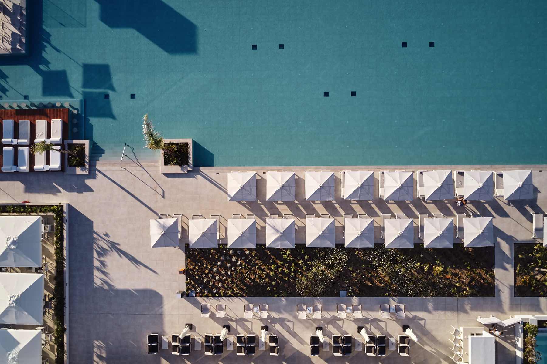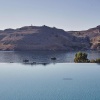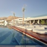 Deluxe Double Room Sea View with Private Pool (35 кв.м + бассейн, максимальное размещение – 2 человека, вид на море). Номер открытой планировки с двуспальной кроватью 160 х 200 см, ванной комнатой с двумя раковинами и душем, собственным бассейном и террасой с лежаками, столиком и стульями.