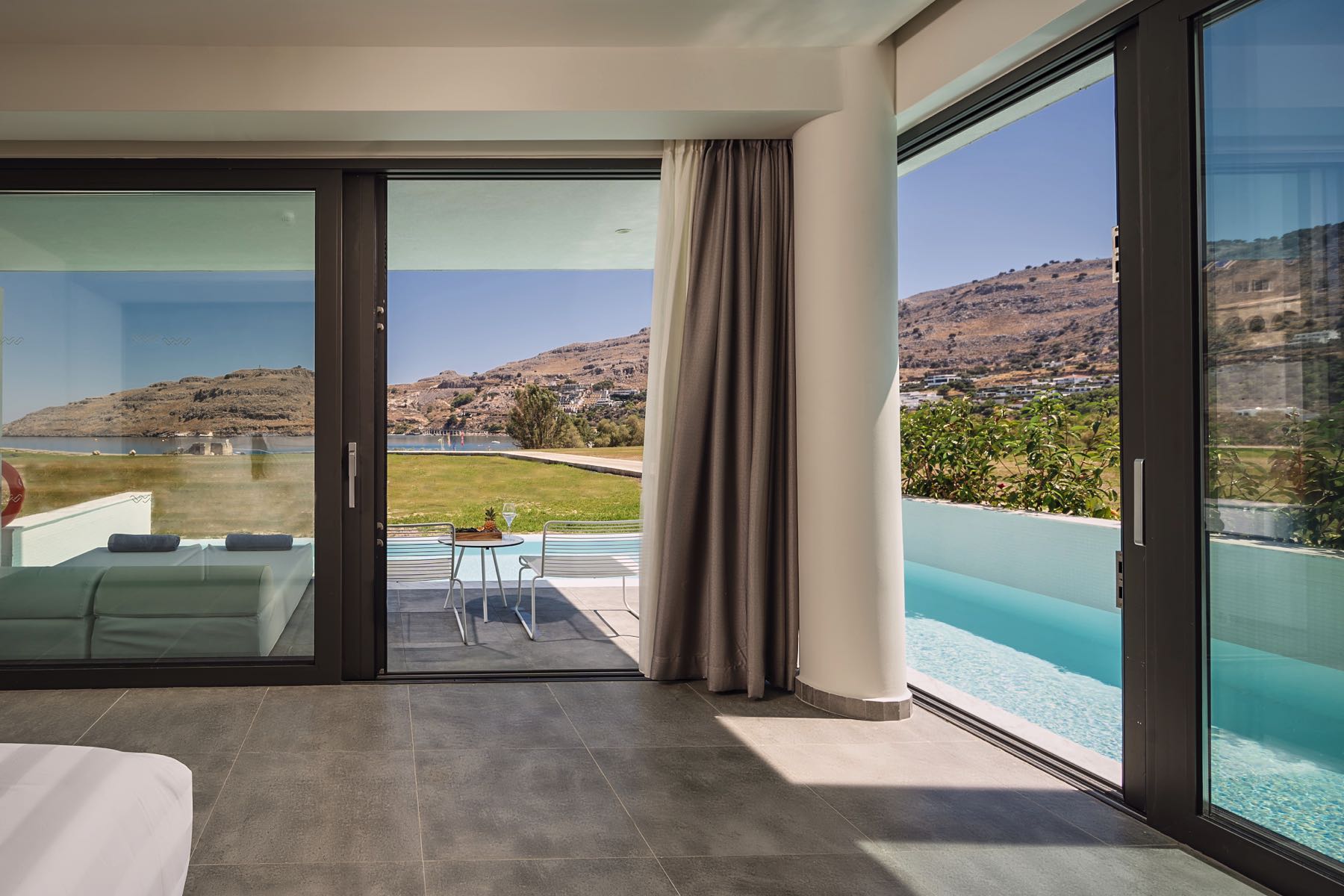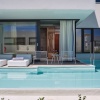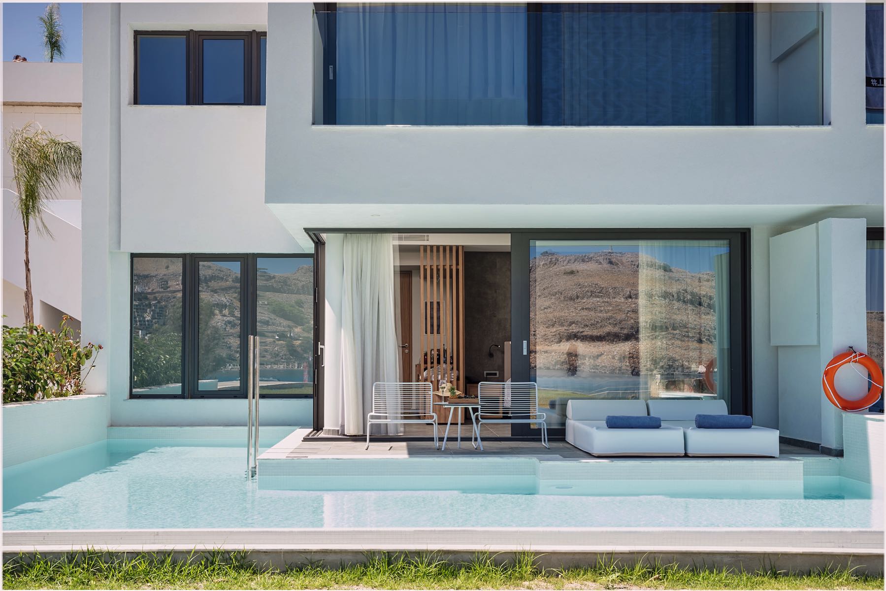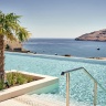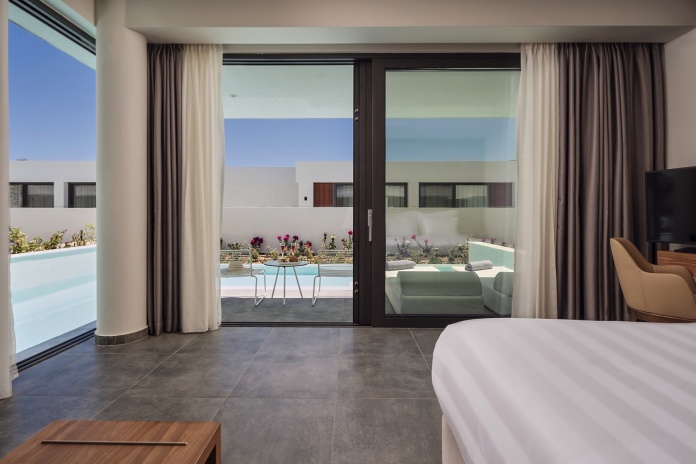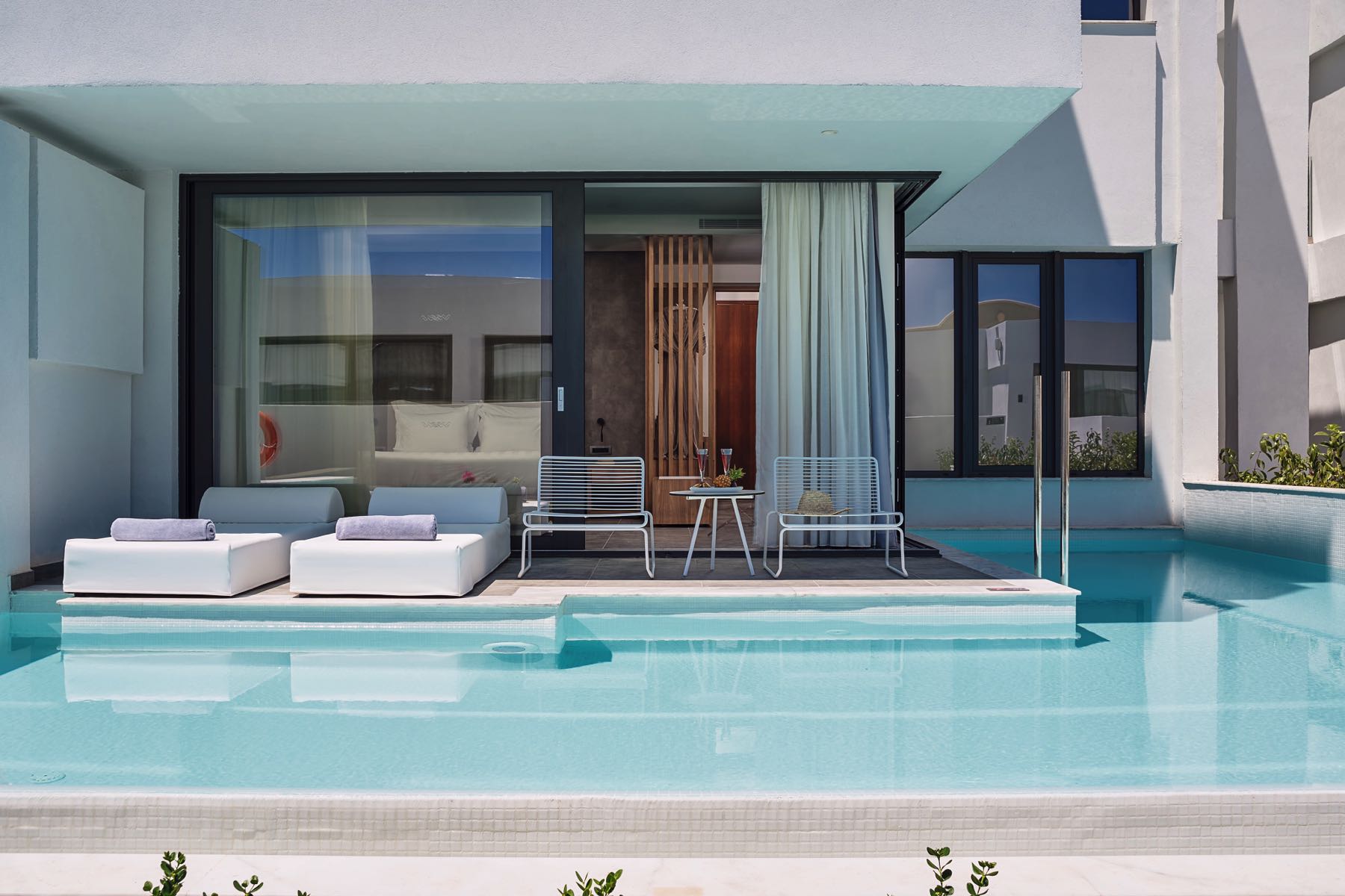 Deluxe Junior Suite Sea View with Private Pool (45 кв.м + бассейн, максимальное размещение – 3 человека, вид на море). Номер с двуспальной кроватью 160 х 200 см и зоной для отдыха с диваном 90 х 200 см (доп. спальное место), ванной комнатой с двумя раковинами и душем, собственным бассейном и террасой с лежаками, столиком и стульями.
