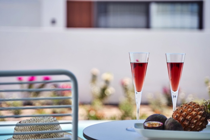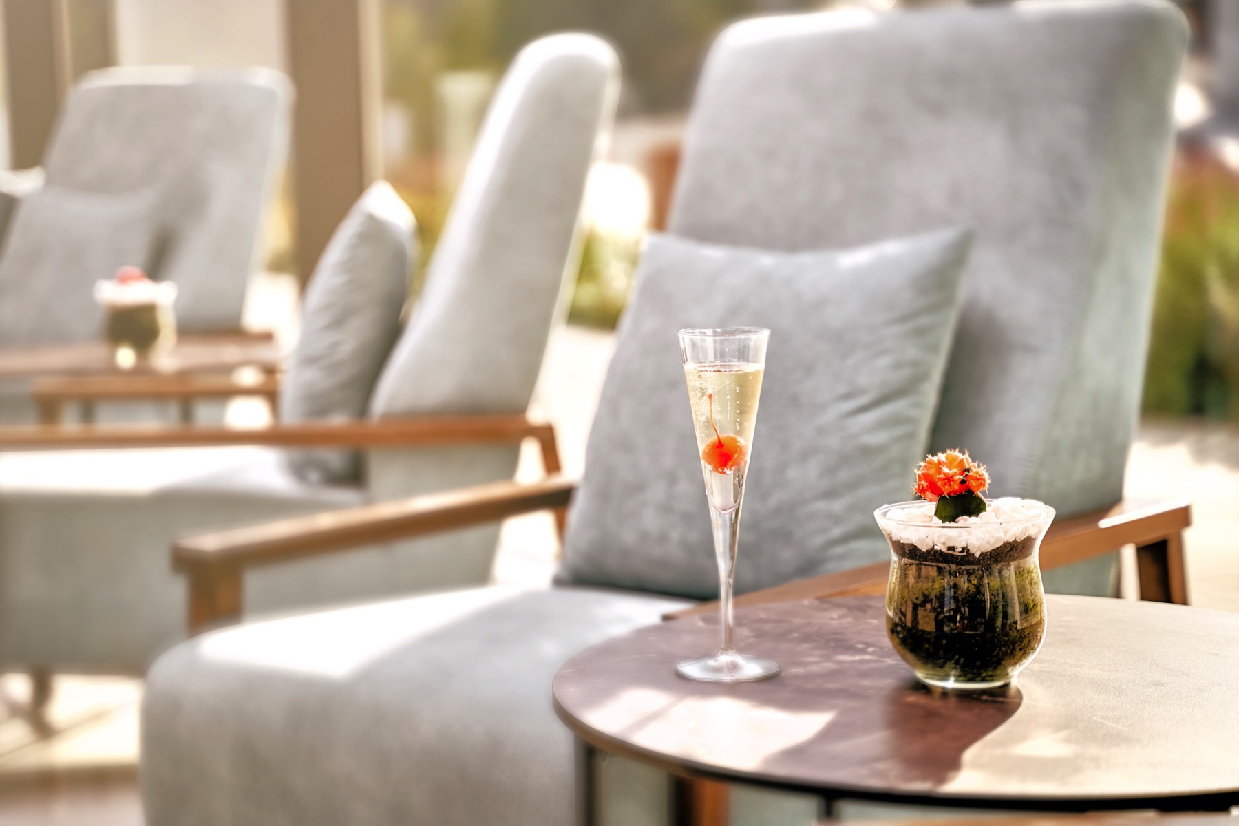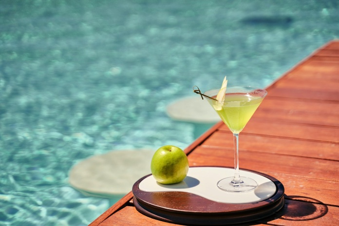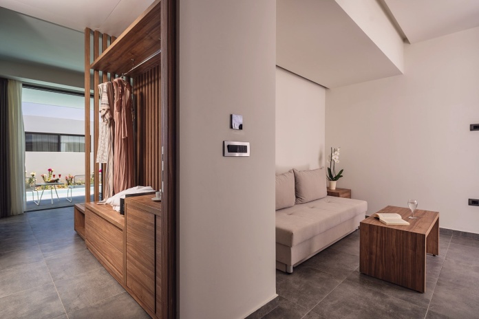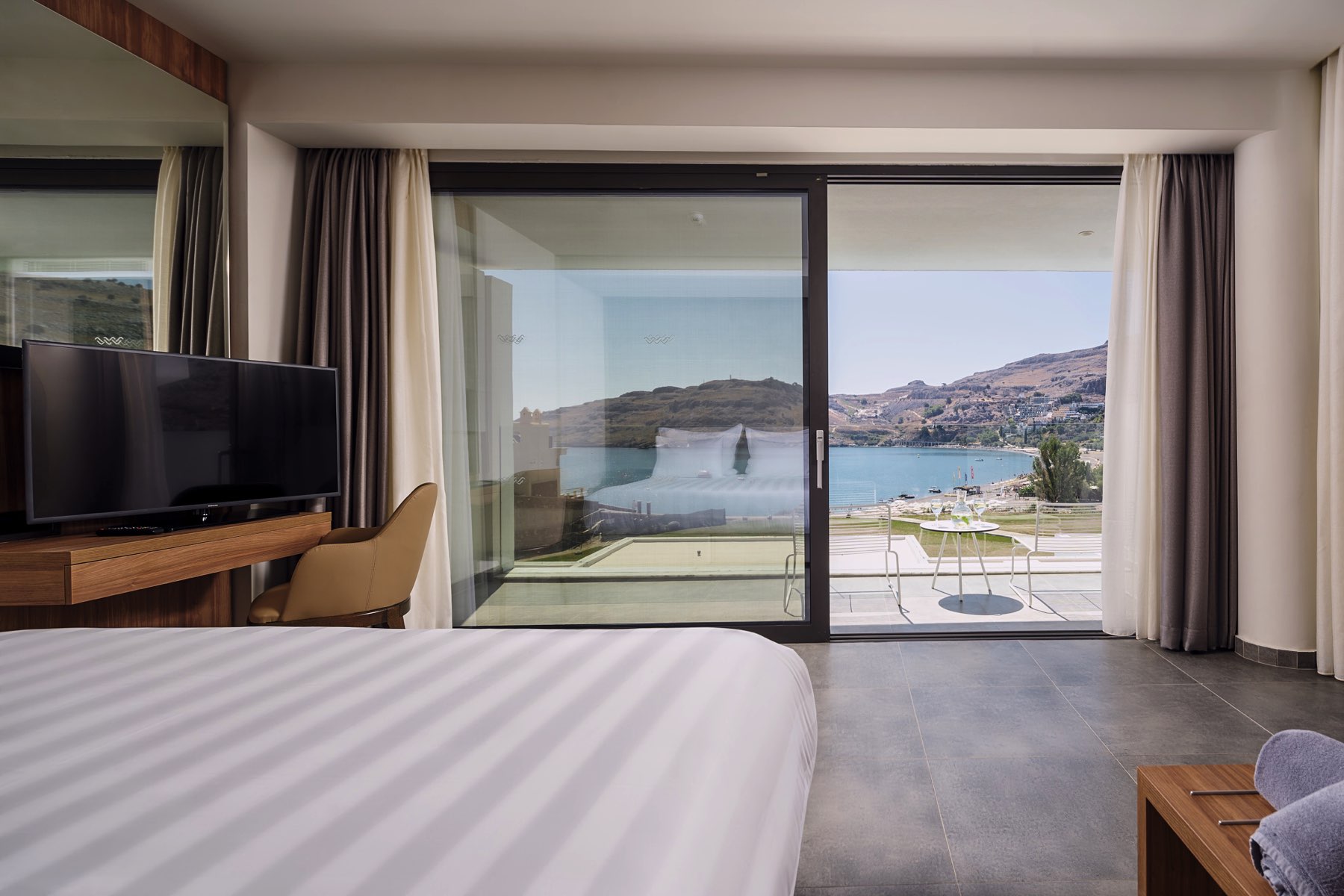 Deluxe Junior Suite Sea View with Private Pool (45 кв.м + бассейн, максимальное размещение – 3 человека, вид на море). Номер с двуспальной кроватью 160 х 200 см и зоной для отдыха с диваном 90 х 200 см (доп. спальное место), ванной комнатой с двумя раковинами и душем, собственным бассейном и террасой с лежаками, столиком и стульями.