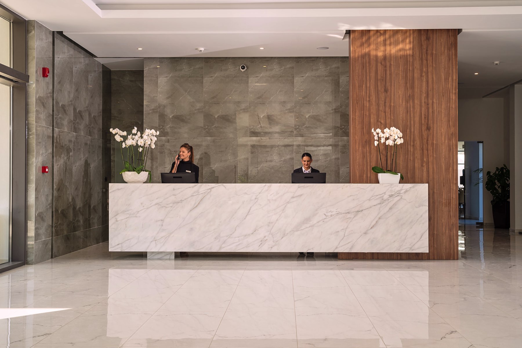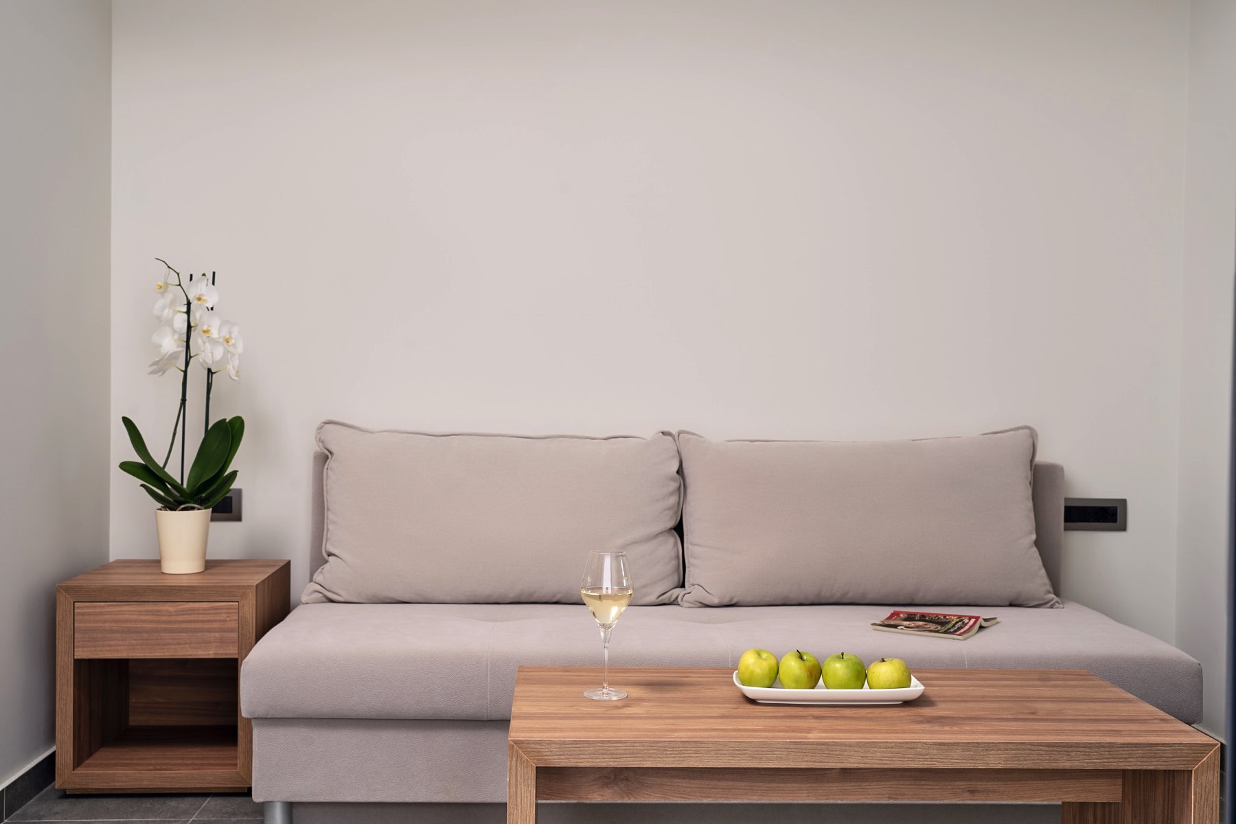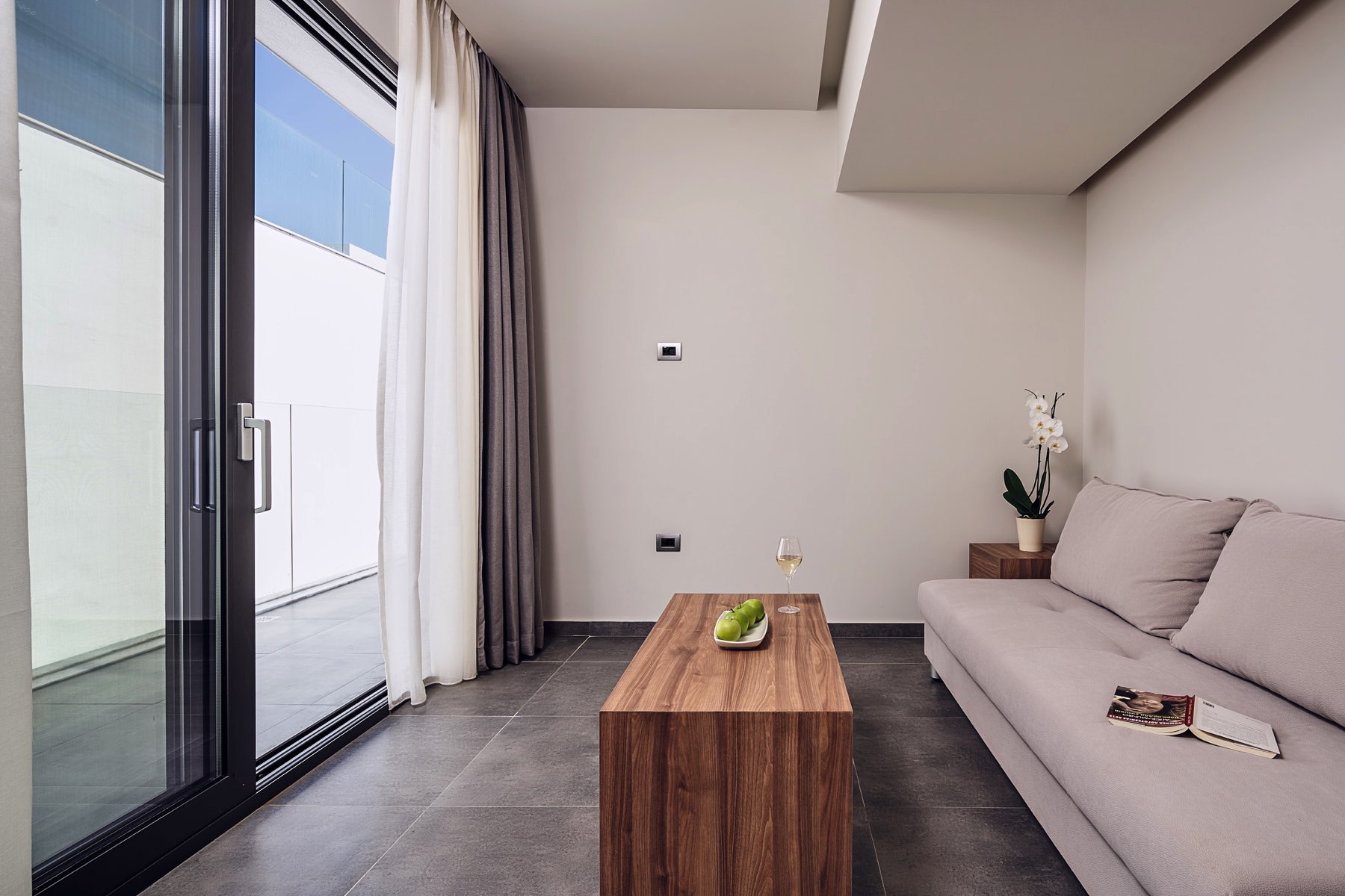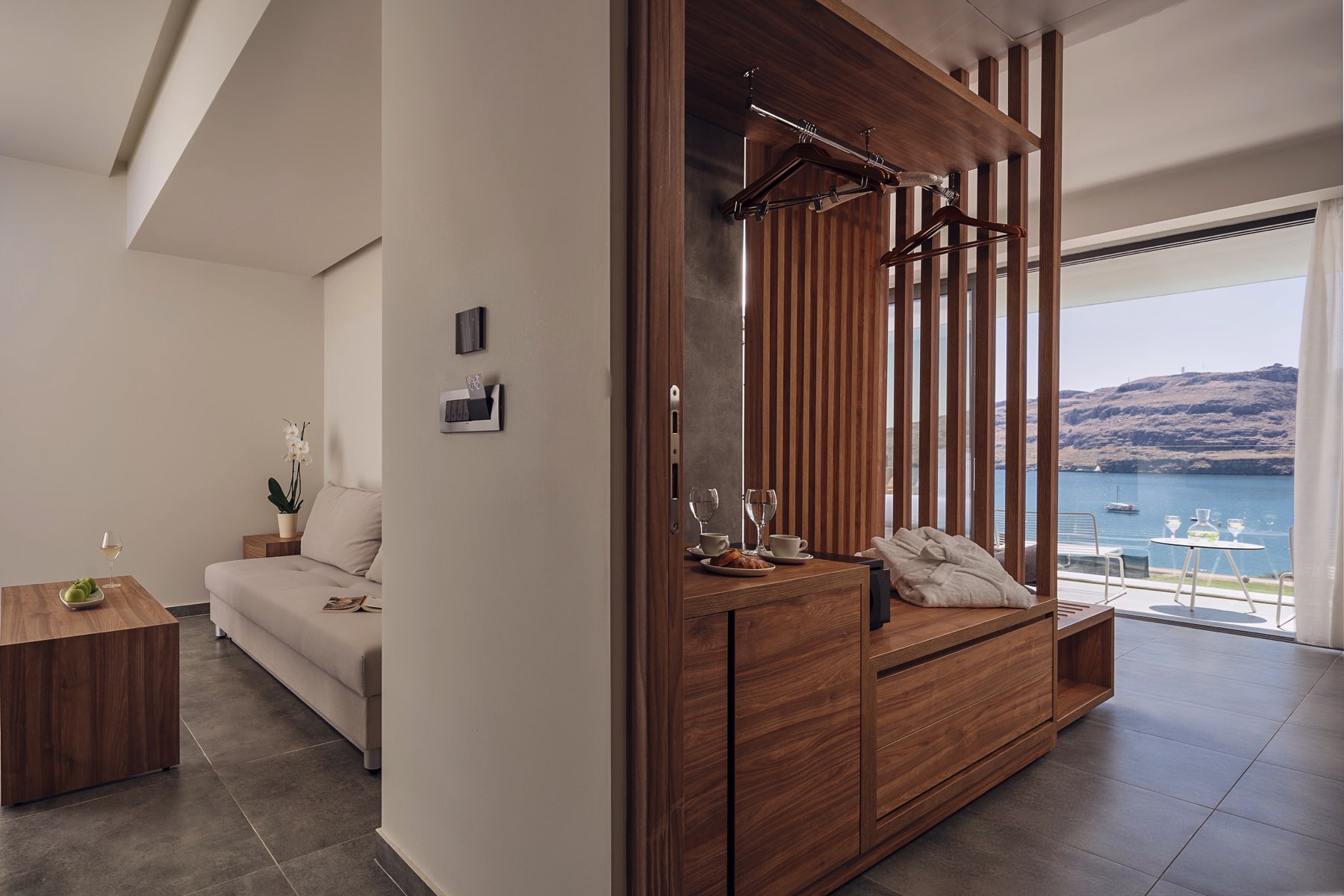 Deluxe Junior Suite Sea View (45 кв.м, максимальное размещение – 3 человека, вид на море). Номер с двуспальной кроватью 160 х 200 см и зоной для отдыха с диваном 90 х 200 см (доп. спальное место), ванной комнатой с двумя раковинами и душем, балконом или террасой со столиком и стульями.