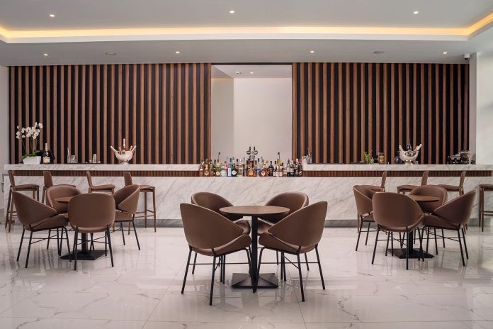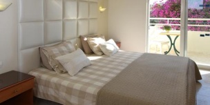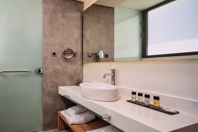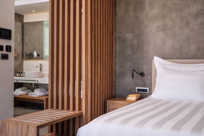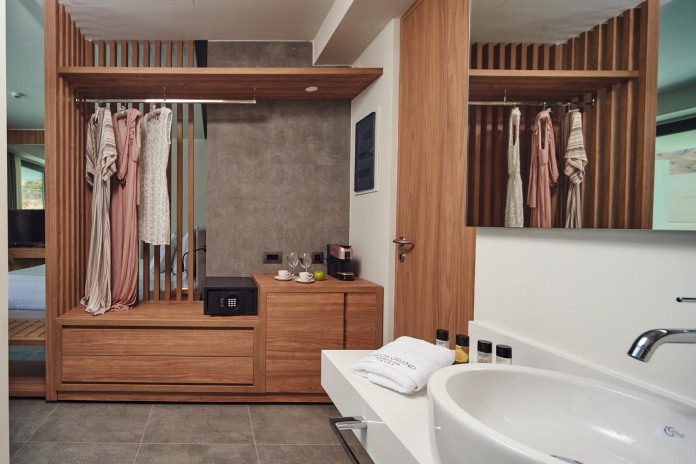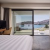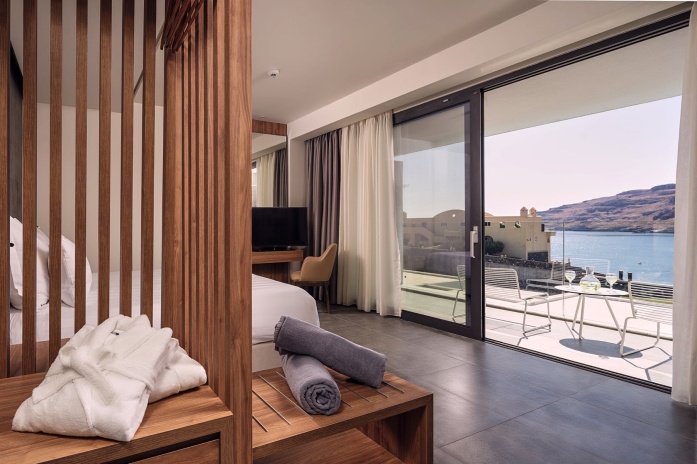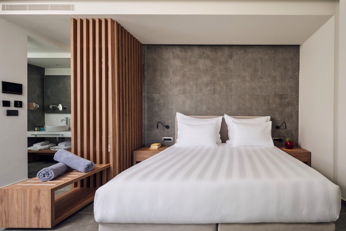 Deluxe Double Room Sea View (35 кв.м, максимальное размещение – 2 человека, вид на море). Номер открытой планировки с двуспальной кроватью 160 х 200 см, ванной комнатой с двумя раковинами и душем, балконом или террасой со столиком и стульями.