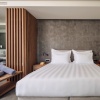 Deluxe Double Room Garden View with Private Pool (35 кв.м + бассейн, максимальное размещение – 2 человека, вид на сад). Номер открытой планировки с двуспальной кроватью 160 х 200 см, ванной комнатой с двумя раковинами и душем, собственным бассейном и террасой с лежаками, столиком и стульями.
