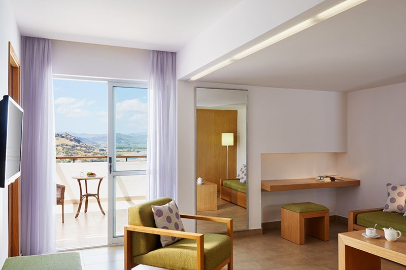 Junior Suite Land View/Sea View (максимальное размещение – 4 человека, вид на море или на сад). Номер открытой планировки с двуспальной или 2 односпальными кроватями, гостиной зоной с одним или двумя диванами и кофейным столиком, ванной комнатой с ванной или душем. Также в номере:  шкаф, туалетный столик с зеркалом, балкон.