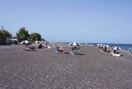 «черный» пляж в 200 метрах от отеля; шезлонги; зонтики у бассейна и на пляже
