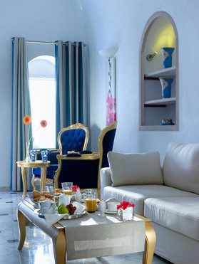 Junior Suite: просторная гостиная, спальня с кроватью и диваном-кроватью, ванная комната с ванной и частными лестницами, которые ведут непосредственно к бассейну отеля, терраса с видом на кальдеру.