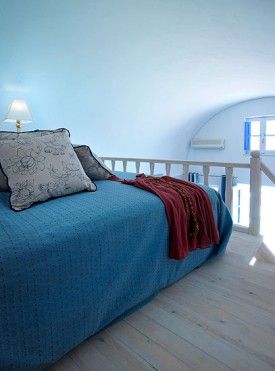 Maisonnette: гостиная, спальня на чердаке с кроватью, ванная комната с ванной, терраса с видом на кальдеру.