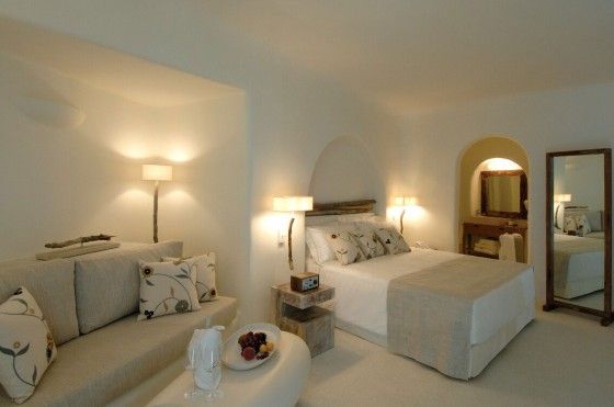 Интерьеры номеров Mystique Санторини выполнены в элегантном стиле, отражающем мотивы греческих островов: белоснежные тона, оригинальная мебель, ткани с античным рисунком, стенные ниши причудливой формы, необычные элементы декора, а с просторных террас открывается потрясающий вид на лазурное море и древнюю кальдеру.