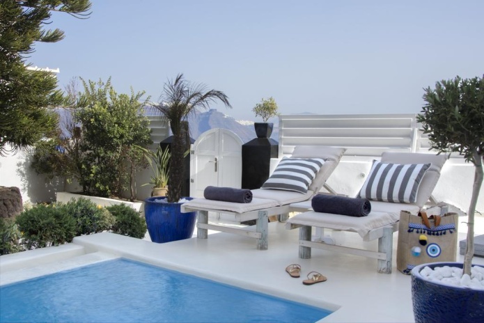 Отель расположен на склоне вулкана в поселке Ия, в 10 км от города Фира, в 18 км от международного аэропорта и морского порта.