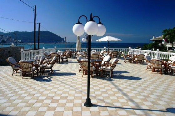 1. Ресторан для завтраков, где находится оливковое дерево в центре зала. Просторная крытая терраса с видом на море и бассейн, а также возможность позавтракать на открытом воздухе. 2. Бар у бассейна предлагает закуски и напитки