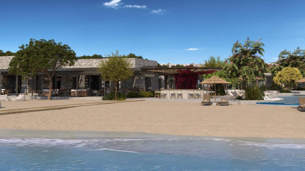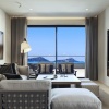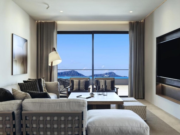 Номера расположены на цокольном этаже, спальня с двуспальной кроватью king-size, гостиная комната с диваном, ванная комната, терраса с частным бассейном, вид на море;