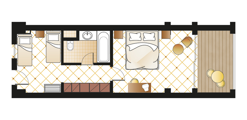 Номера расположены в основном здании на верхних этажах, прямой вид на море, 2 спальни (раздвижная дверь между комнатами): двуспальная кровать queen-size или 2 односпальные кровати + 1 дополнительная односпальная кровать, ванная комната с ванной, балкон 7 м², см.план номера, см.фото номера;