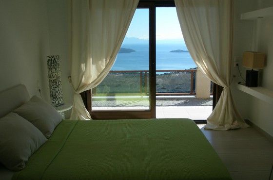 На нижнем этаже спальня с двуспальной кроватью и одна с двумя односпальными кроватями и просторными ванными комнатами, балконы с видом на море