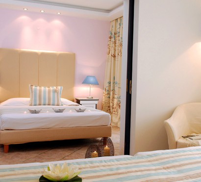 Suite Deluxe (~45 кв.м) Расположены прямо на берегу моря, где растут высокие финиковые пальмы. Романтический стиль, тяжелые шторы отделяют спальню с двуспальной кроватью от комфортабельного салона с диваном, 2 меблированных балкона. Возможное размещение 2 взрослых и 2 детей до 12 лет.