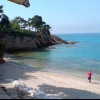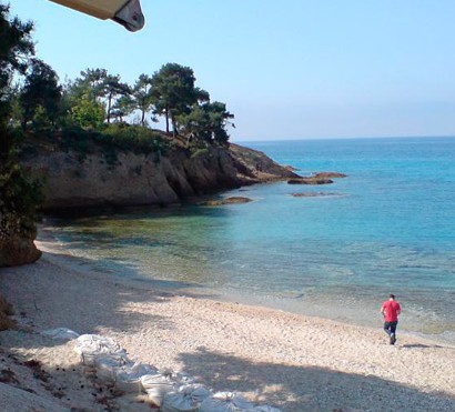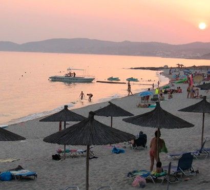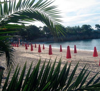 Песчаный в 50 м, отмечен Голубым флагом ЕС. В некоторых местах сосны подходят прямо к воде. Лежаки бесплатно Зонтики бесплатно