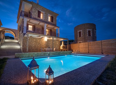 На первом этаже - полностью оборудованная кухня со всеми необходимыми принадлежностями и современной бытовой техникой, просторная столовая, уютная гостинаяс камином, спутниковое ТВ, телевизор с ЖК-экраном в комплекте с аудиосистемой, спальня с двуспальной кроватью и ванной комнатой. На втором этаже - 2 спальни, туалет и ванная комната с джакузи. Все комнаты оборудованы кондиционерами. Двор выложен камнем, барбекю, частный бассейн, душ на открытом воздухе, территория украшена цветами, есть прямой доступ к морю. Для комфорта гостей лежаки и зонтики находятся и на пляже и у бассейна. Есть частная парковка.