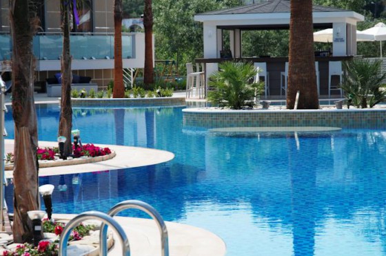 2 открытых бассейна с пресной водой (700 кв.м. и 200 кв.м.) и подогреваемый крытый бассейн в спа,