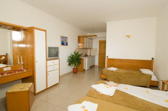 Всего в отеле 48 номеров. Studios (33 кв.м), Apartments 1-Broom (35 кв.м), Apartments 2-Brooms (37 кв.м). В номерах: полностью оборудованный кухонный уголок, индивидуальный кондиционер (за доплату), телевизор, прямой телефон, Wi-Fi интернет (бесплатно), ванна (в некоторых Studio - душ), фен,балкон/терраса Тип дополнительной кровати: стандартная (маленькая) Studio Возможное размещение: 4 взрослых и ребенок (до 12 лет) или 2 взрослых и 3 детей (до 12 лет). Двуспальная кровать или 2 односпальные кровати. Apartment 1-Broom Спальня и салон. В спальне – двуспальная кровать или 2 односпальные кровати. Возможное размещение: 3 взрослых или 2 взрослых и ребенок (до 12 лет). Apartment 2-Brooms 2 спальни. В одной – двуспальная кровать, во второй – две односпальные кровати, салон. Возможное размещение: до 5 взрослых.