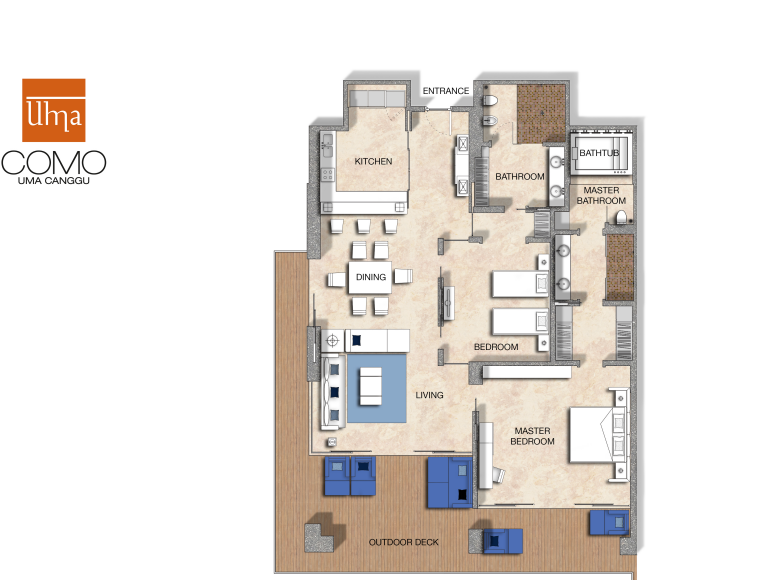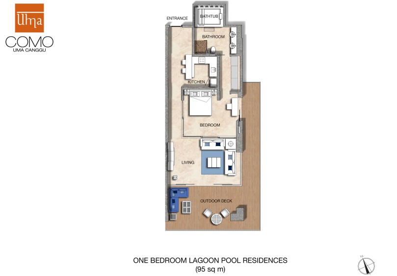 Спальня с двуспальной кроватью king-size, отдельная гостиная комната с диваном и обеденным столом, ванная комната с ванной и душем, внутренний дворик с душем на открытом воздухе, план номера;