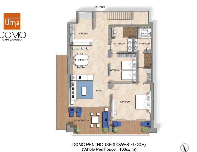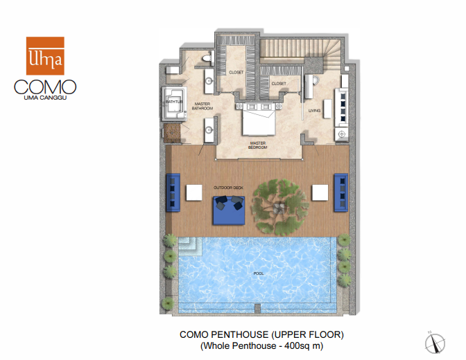Двухуровневый номер, 3 спальни с двуспальными кроватями king-size, отдельная гостиная комната с обеденной зоной и кухней, 3 ванные комнаты, меблированная терраса, собственный бассейн на крыше (длина 10 м), панорамный вид на океан, план первого этажа, план второго этажа.
