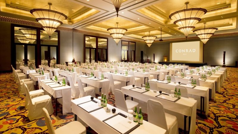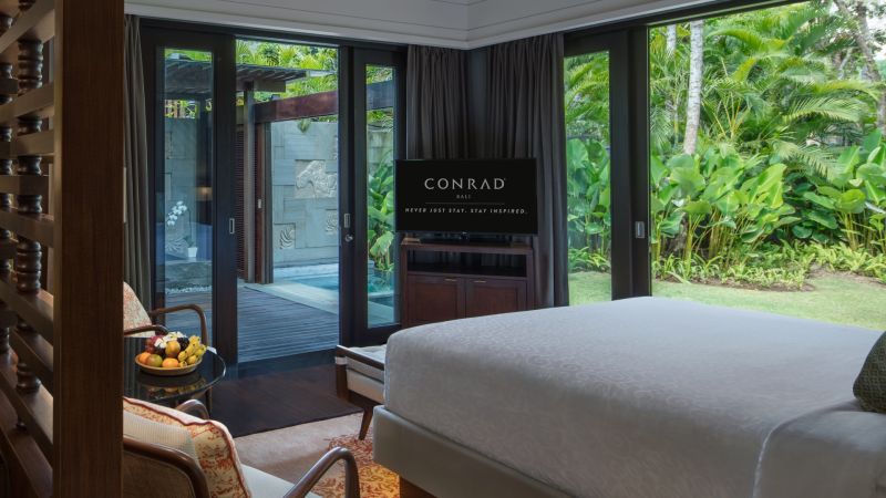 Conrad Bali Resort состоит из нескольких зданий разной этажности, в т.ч. эксклюзивная зона Conrad Suites. Развитая инфраструктура, разнообразные мероприятия в течение дня для детей и взрослых. К услугам гостей открытые бассейны, спа-центр с рядом оздоровительных и восстанавливающих силы процедур, тренажёрный зал, детский клуб, теннисные корты и конференц-залы.