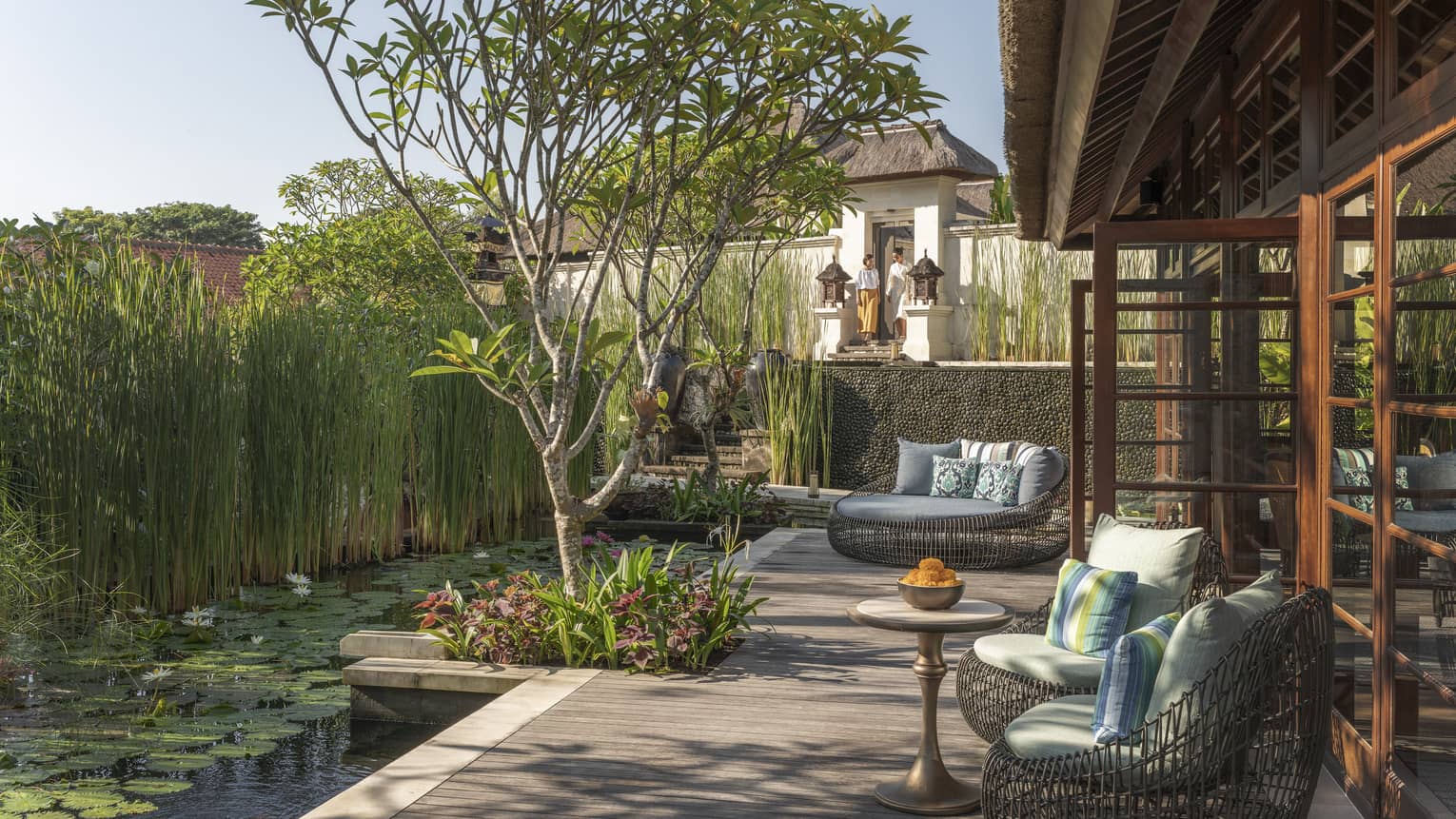 Расположена на склоне холма среди садов, 2 спальни: двуспальная кровать king-size и 2 односпальные кровати, возможно по 1 дополнительной кровати в каждой спальне, 2 ванные комнаты с ванной и душем, 2 душа под открытым небом, терраса с гостиной зоной с диванами и обеденным столом, лежаки, небольшой частный бассейн, вид на сад, план номера;