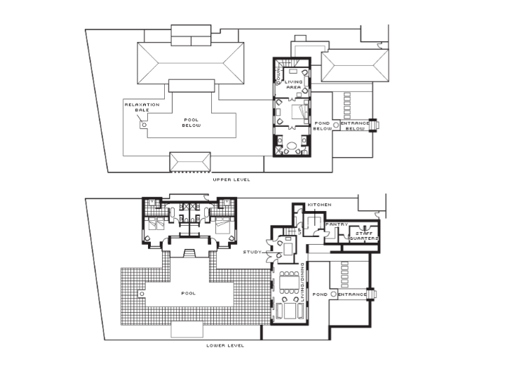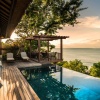 Расположена рядом с океаном или высоко на склоне холма, вуспальная кровать king-size или 2 односпальные кровати, гостиная зона с диваном, ванная комната с ванной и душем, душ под открытым небом, меблированная терраса, небольшой частный бассейн, частный сад, панорамный вид на океан, план номера;