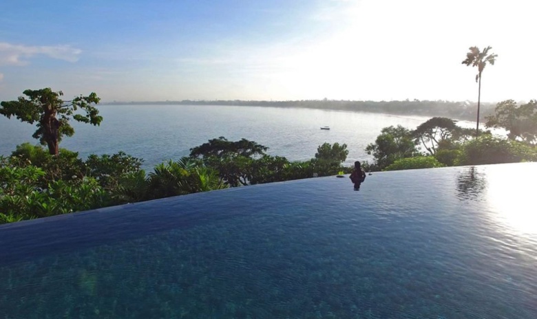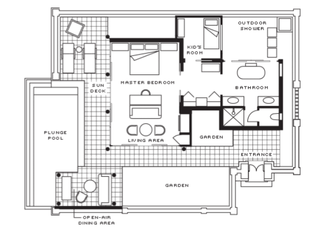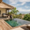 Расположена на склоне холма среди садов, спальня с двуспальной кроватью king-size и гостиной зоной, детская комната с раздвижной кроватью для 2-х детей, ванная комната с ванной и душем, душ под открытым небом, меблированная терраса, небольшой частный бассейн, частный сад, вид на сад и частично на океан, план номера;