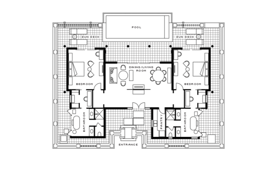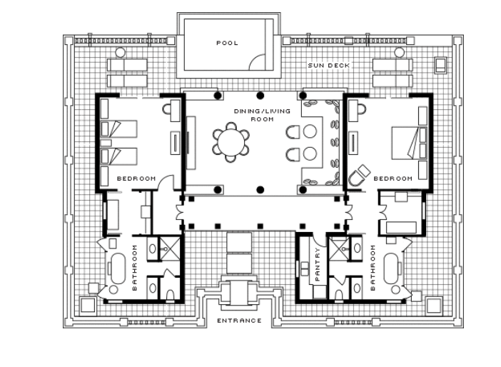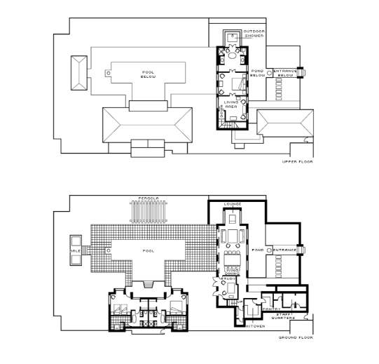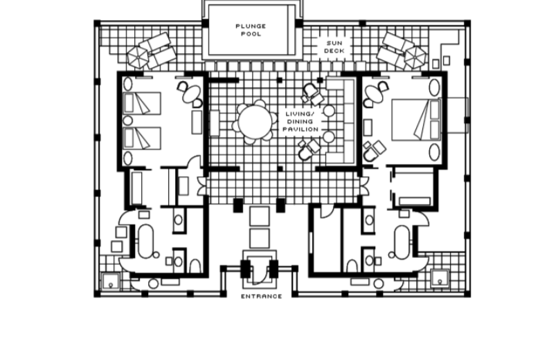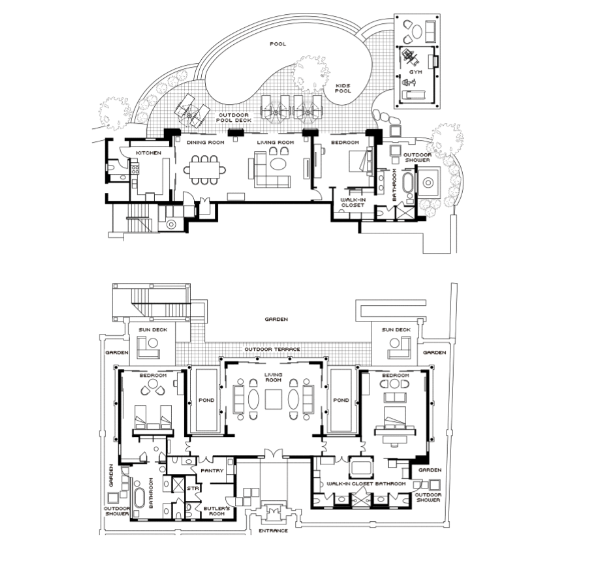 Виллы в первом ряду на углу, ближе всего к океану, двухэтажная вилла, 3 спальни: 2 двуспальные кровати king-size и 2 односпальные кровати, возможно по 1 дополнительной кровати в каждой спальне, 3 ванные комнаты с ванной и душем, 3 душа под открытым небом, 2 гостиные комнаты, обеденная зона, кухня, меблированные террасы, комната для дворецкого, тренажёрный зал, частный бассейн infinity, вид на океан, личный шеф-повар, ежедневный завтрак (свежеприготовленный на кухне виллы личным шеф-поваром), обратный трансфер из аэропорта, круглосуточные услуги дворецкого, частный инструктор йоги и личный тренер для студии йоги на вилле, план номера;