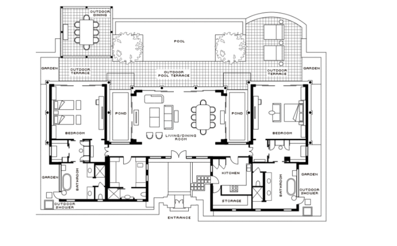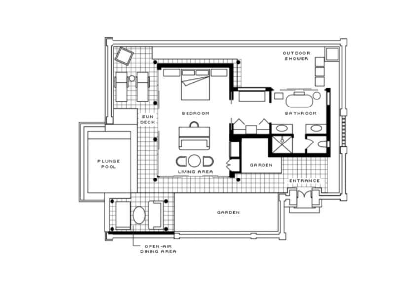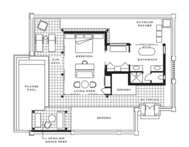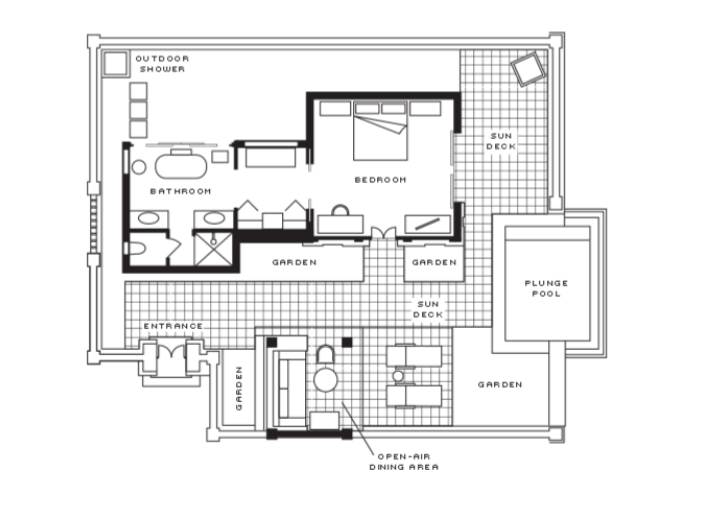 Двуспальная кровать king-size или 2 односпальные кровати, возможна одна дополнительная кровать, ванная комната с ванной и душем, душ под открытым небом, меблированная терраса, небольшой частный бассейн, вид на сад, есть смежные номера план номера;