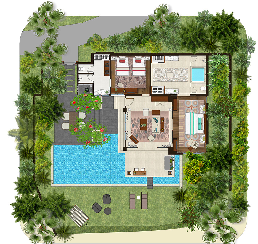 2 спальни: двуспальная кровать king-size (200 x 200 см) или 2 односпальные кровати (120 х 200 см), отдельная гостиная комната, 2 ванные комнаты, частный бассейн (32 м²), вид на сад, план номера;