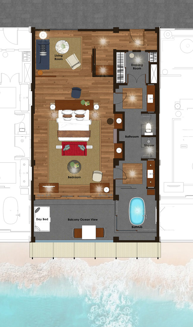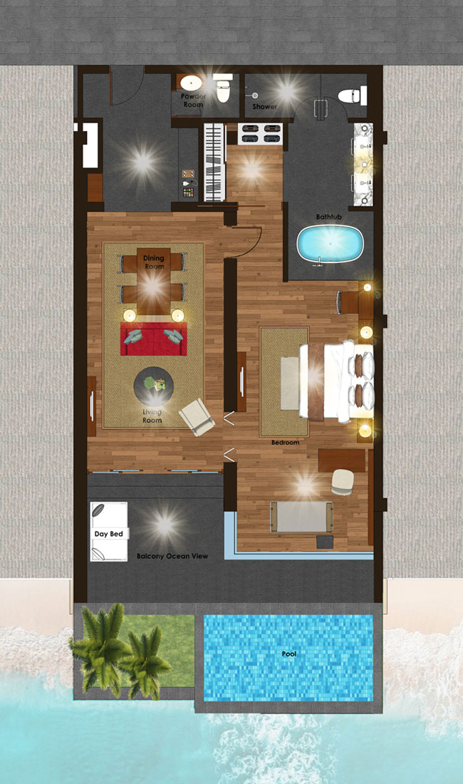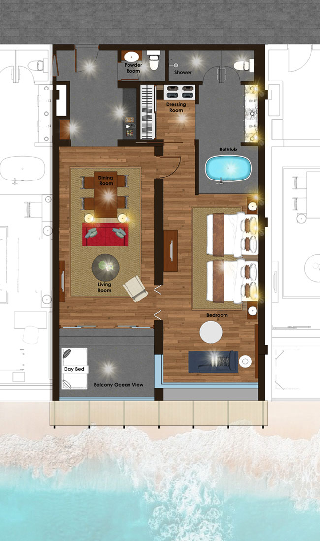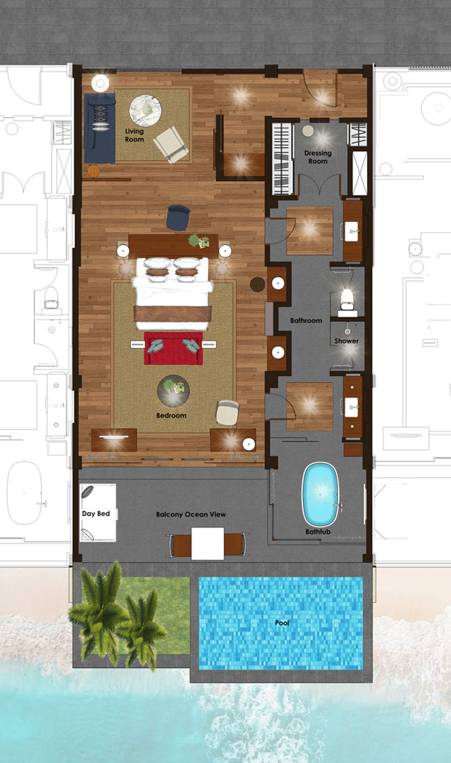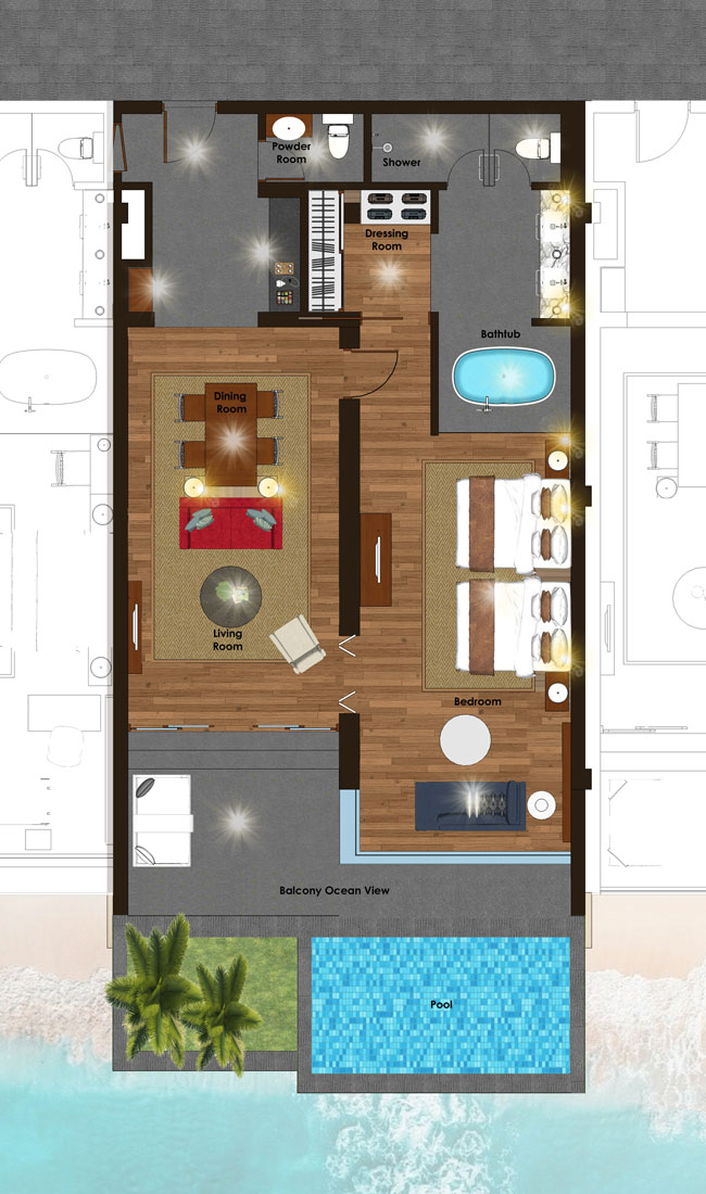 2 спальни: двуспальная кровать king-size (200 x 200 см) или 2 односпальные кровати (120 х 200 см), отдельная гостиная комната, 2 ванные комнаты, частный бассейн (32 м²), вид на океан, план номера;