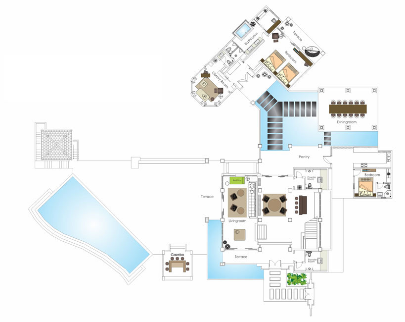 Двухэтажная резиденция, 2 спальни: двуспальная кровать king-size (200 x 200 см) или 2 односпальные кровати (120 х 200 см), 2 ванные комнаты, гостиная и столовая, 3 гостевых туалета, терраса, частный бассейн, панорамный вид на океан, библиотека, план номера 1 этаж, план номера 2 этаж.