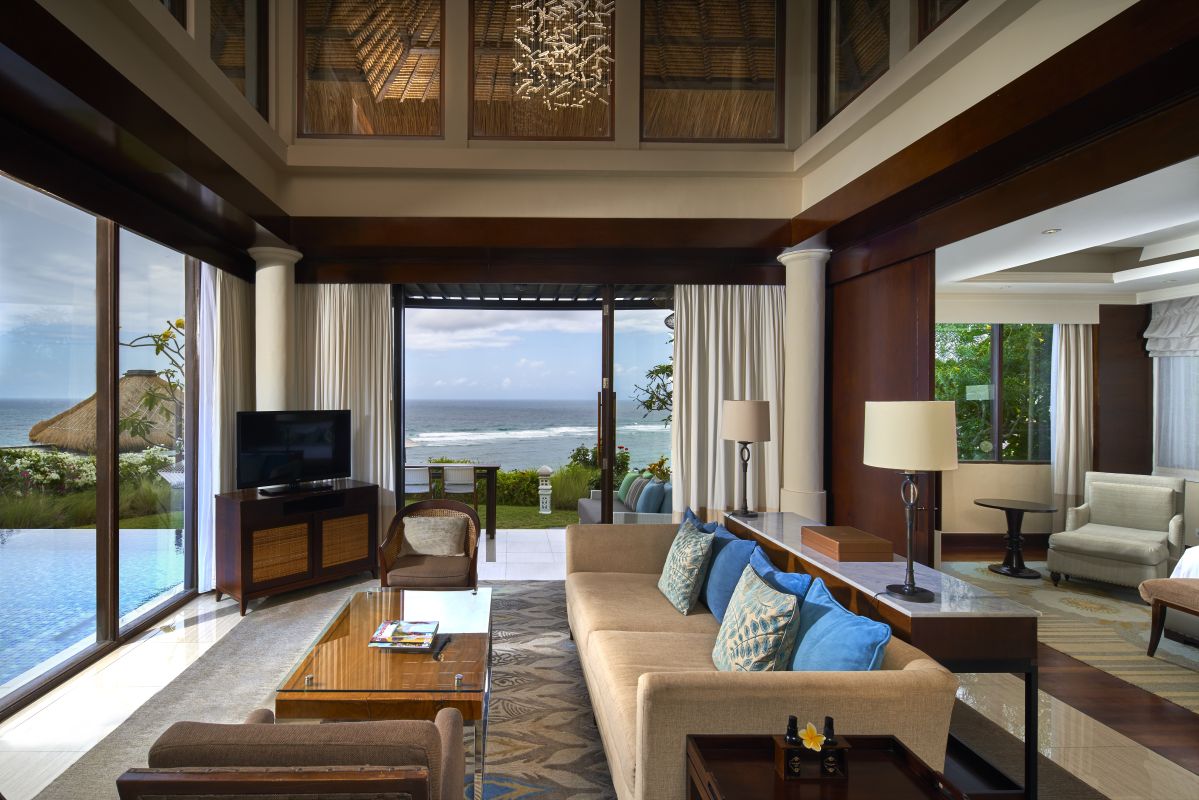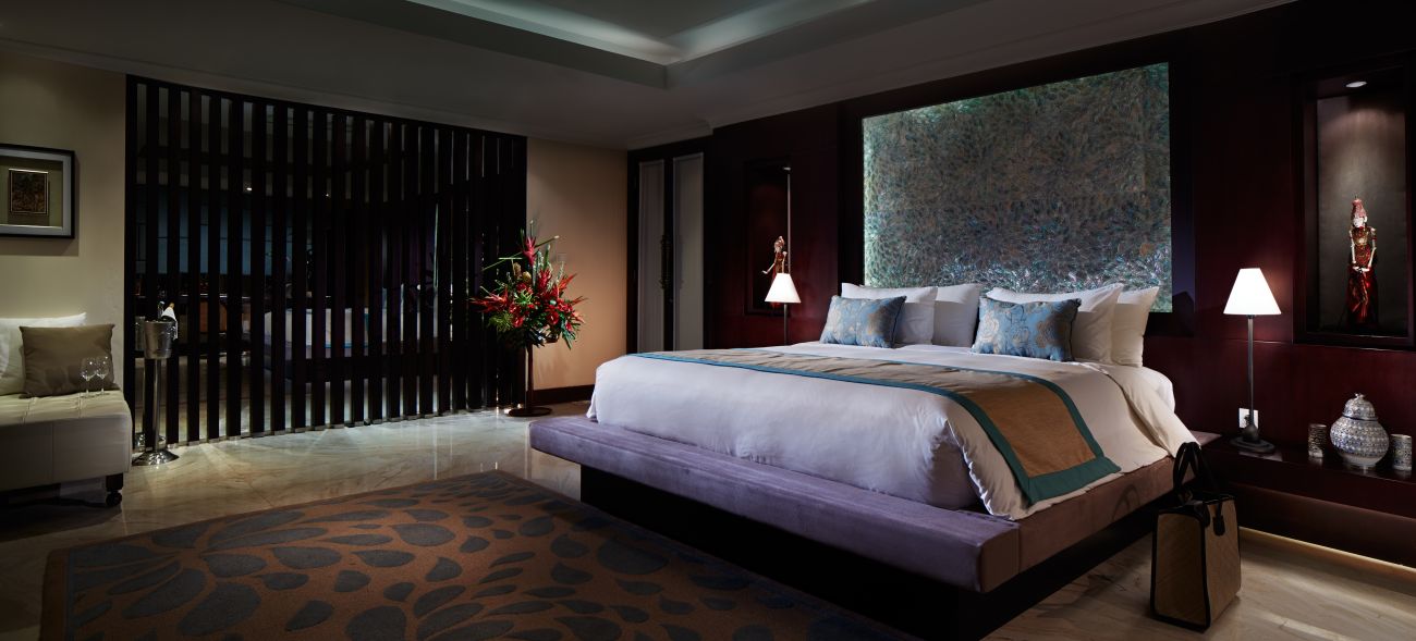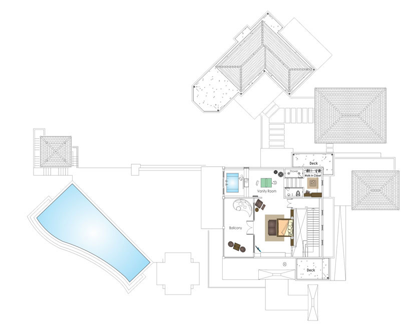 Расположены на 4 этаже в East Wing или West Wing, 2 спальни: двуспальная кровать king-size (200 x 200 см) или 2 односпальные кровати (120 х 200 см), отдельная гостиная комната, 2 ванные комнаты, балкон, частный бассейн (5,5 х 4 м), панорамный вид на океан, план номера;