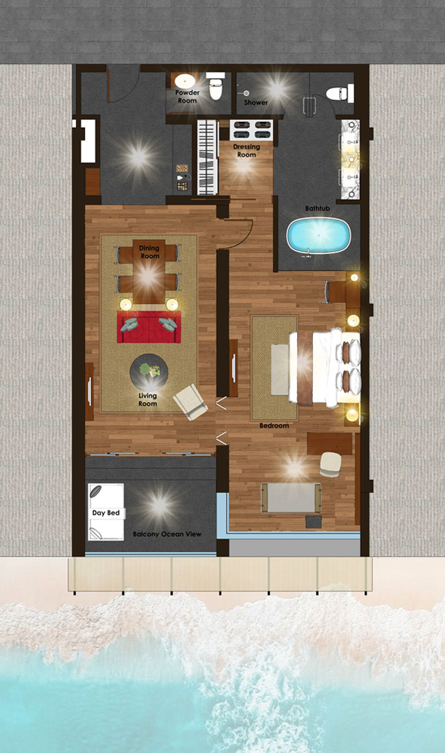 Расположены на 1 этаже корпуса Suite (East Wing или West Wing), двуспальная кровать king-size (200 x 200 см), гостиная зона с диваном, ванная комната с ванной и душем, гардеробная, балкон, в каждом номере есть ночной телескоп, частый бассейн и садик (бассейн и сад занимают площадь 18 м²), панорамный вид на океан, план номера;