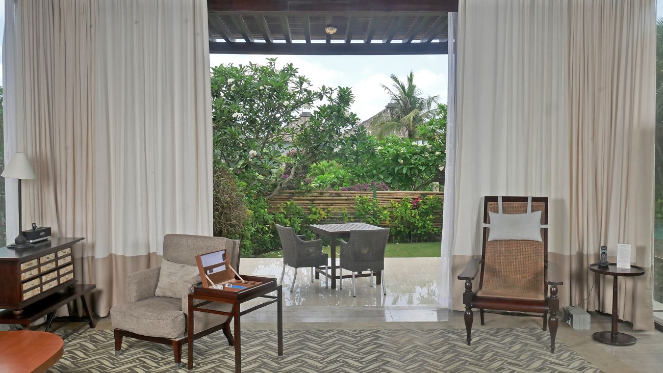 Спальня с двуспальной кроватью king-size (200 x 200 см), отдельная гостиная комната, ванная комната с ванной и душем, меблированная терраса, частный бассейн (32 м²), открытый душ в саду, вид на сад, план номера;