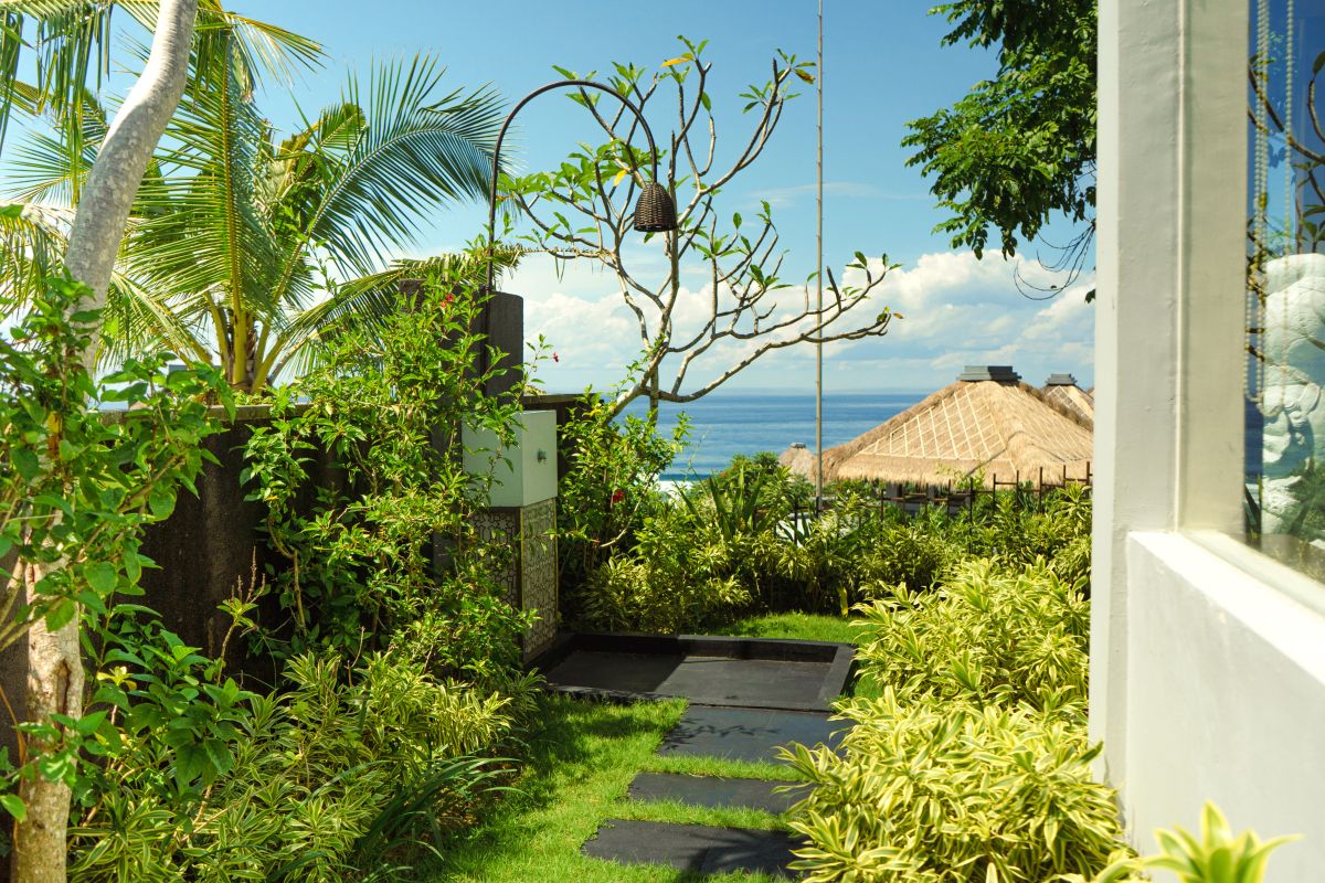 Спальня с двуспальной кроватью king-size (200 x 200 см), отдельная гостиная комната, ванная комната с ванной и душем, меблированная терраса, частный бассейн (32 м²), открытый душ в саду, вид на океан, план номера;