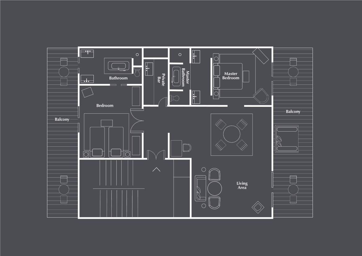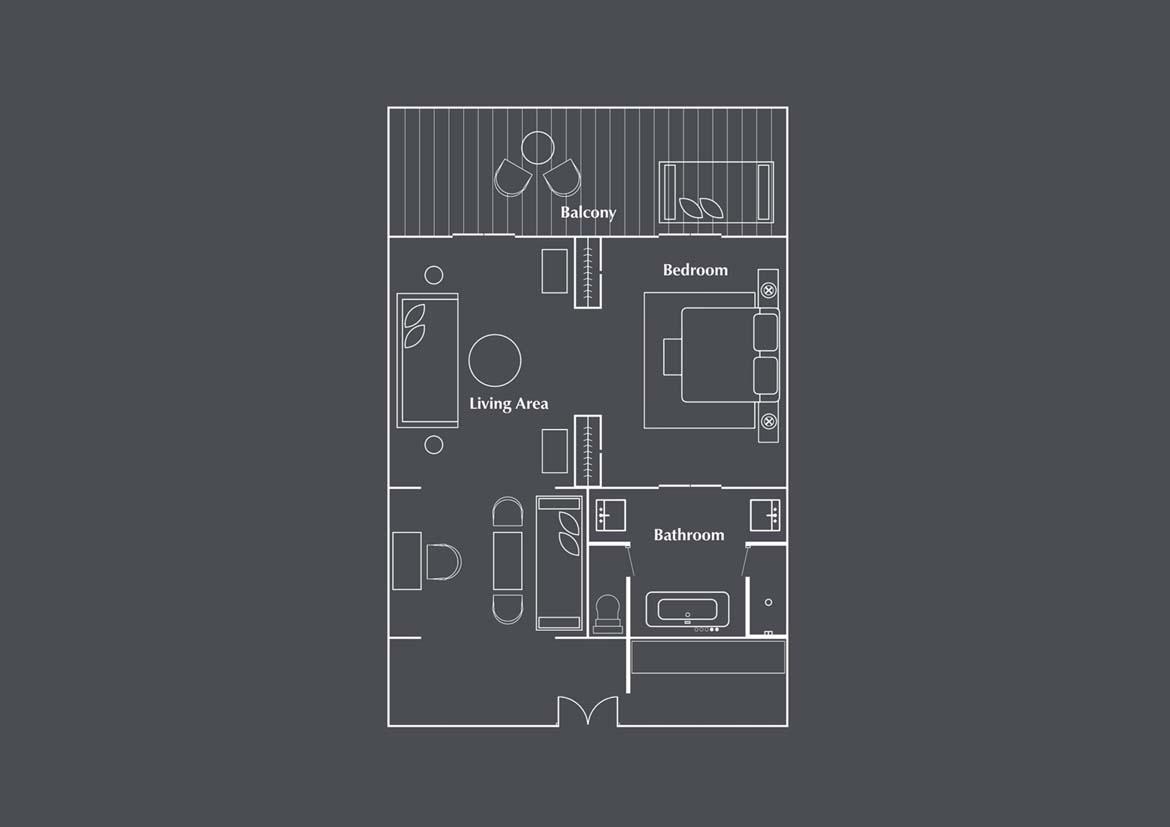 Расположен на втором этаже, 2 спальни: двуспальная кровать king-size и 2 односпальные кровати, 2 ванные комнаты с ванной, отдельная гостиная комната с диваном и обеденным столом, балкон, вид на океан, преимущества The Club by The Legian Seminyak, см. план номера;