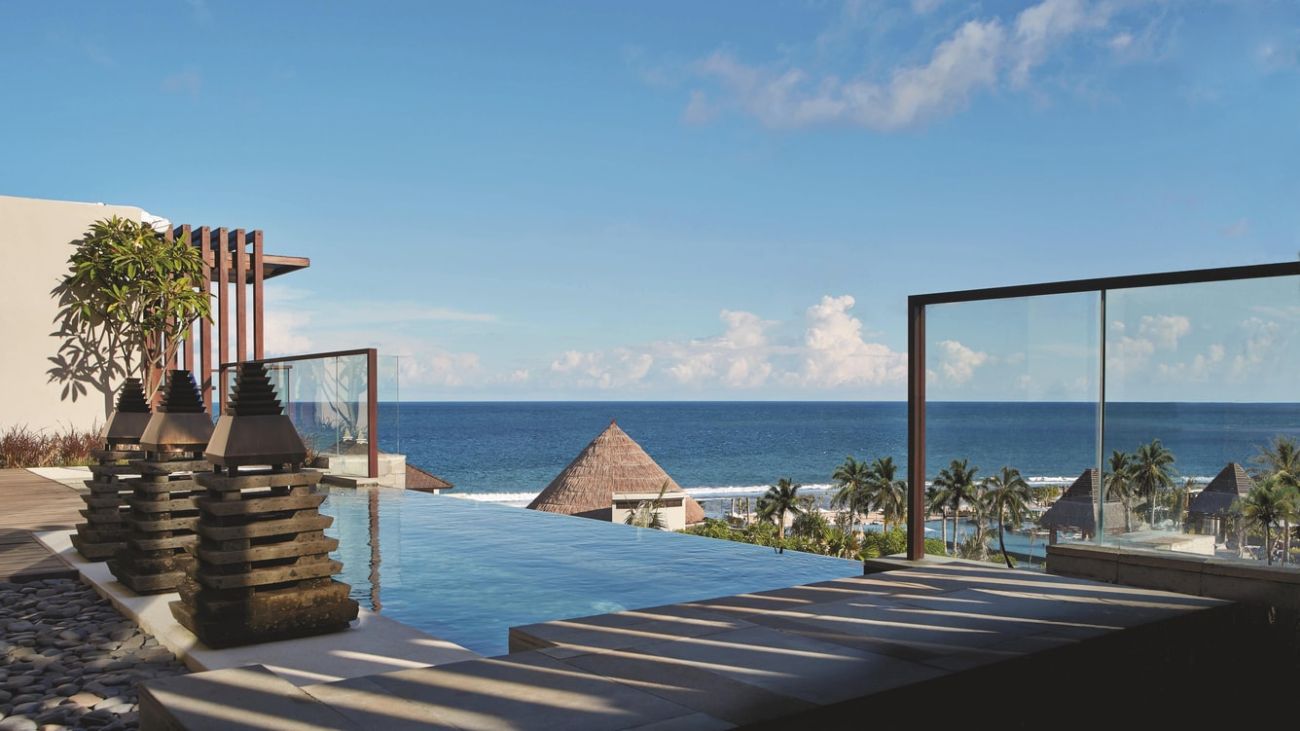 Двуспальная кровать king-size, гостиная зона, ванная комната с ванной и душем, терраса, персональный бассейн, вид на океан;