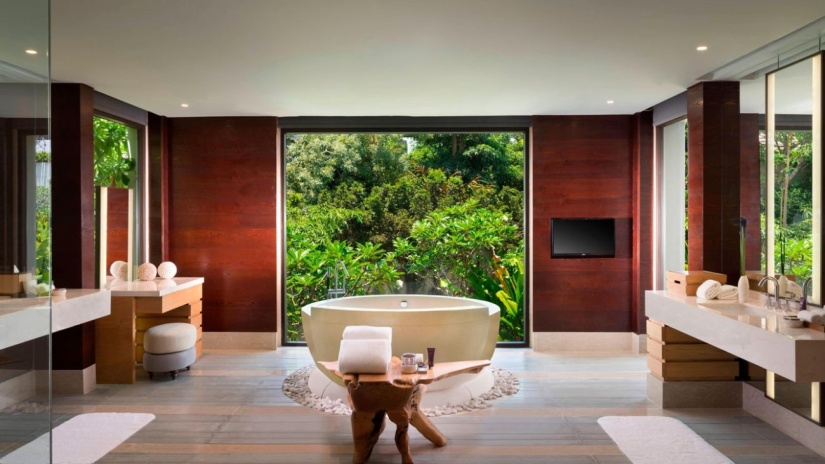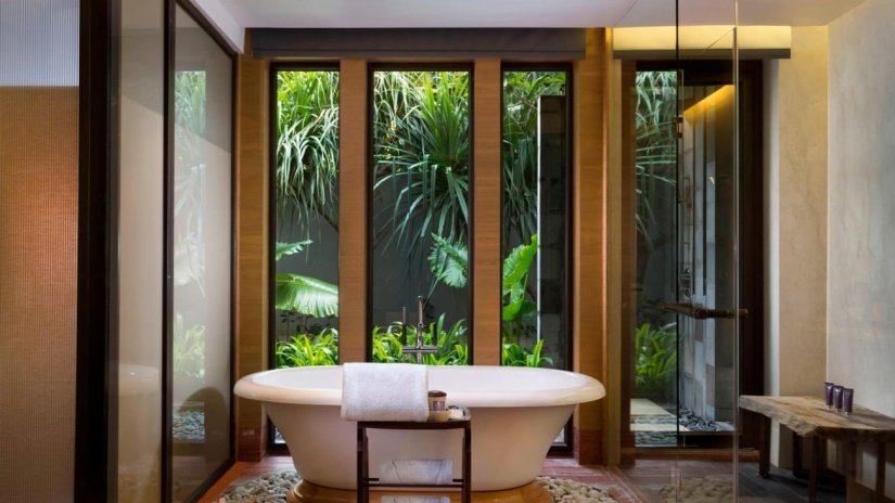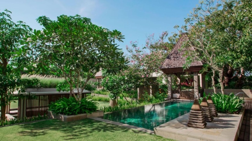 Двухэтажная вилла в балийском стиле, расположенная в окружении пышного сада, спальня с двуспальной кроватью king-size, отдельная гостиная комната с диваном и обеденным столом, ванная комната с ванной и душем, гардеробная, терраса, персональный бассейн, балкон, патио;